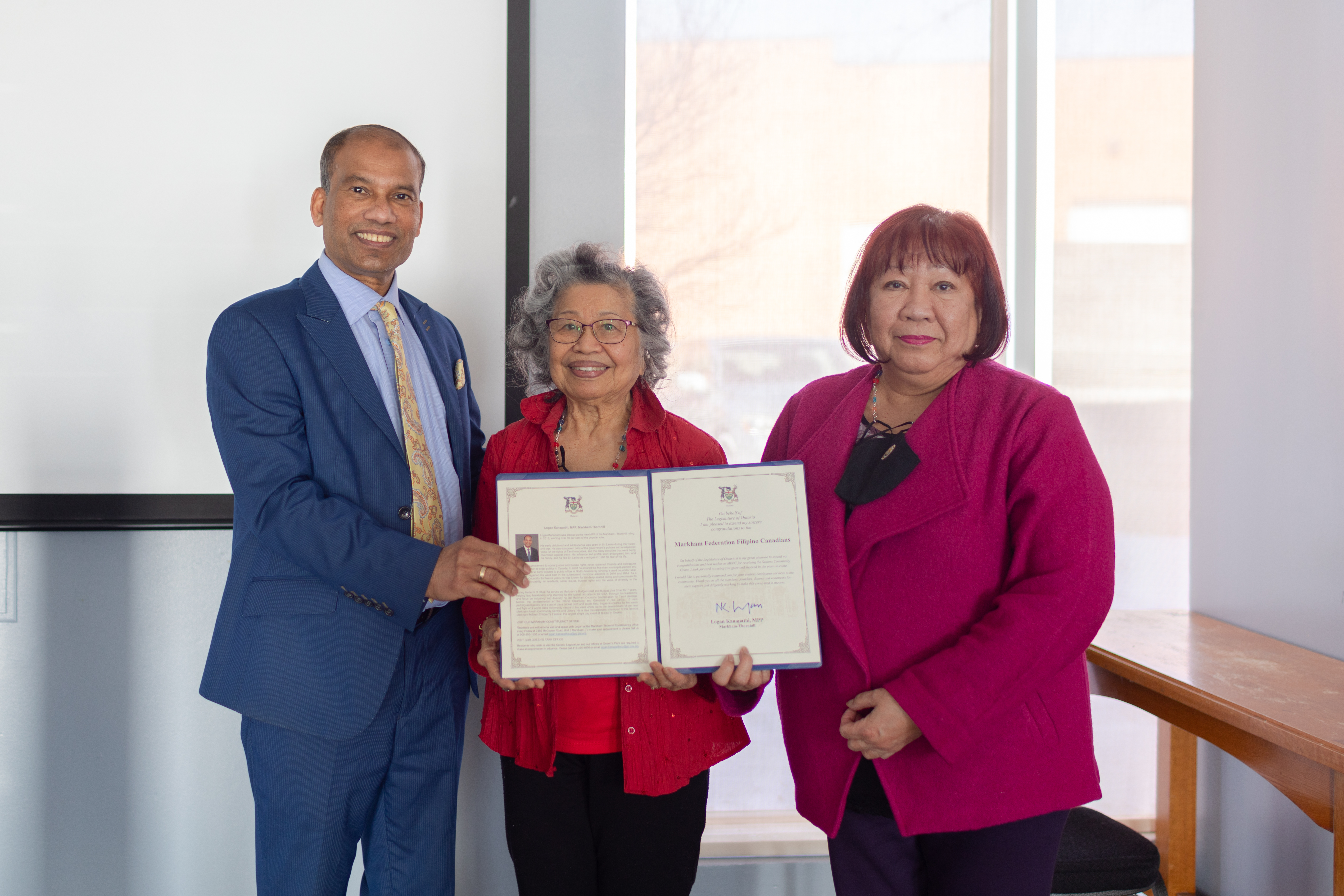 On Febraury 25, 2022, the Honorable Logan Kanapathi visited our community centre to announce and present a certificate for the recent grant we have received from the Ontario Seniors Community Grant program of $22,570. Please click here to watch the video clip of the event.